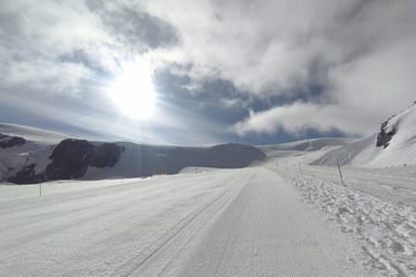There’s a small building offering food, drinks and most importantly toilets. We stopped here and fitted crampons and the harness. Giovanni then led me through a subtle gradient that is part of a ski path. The path wasn’t busy because it was summertime.