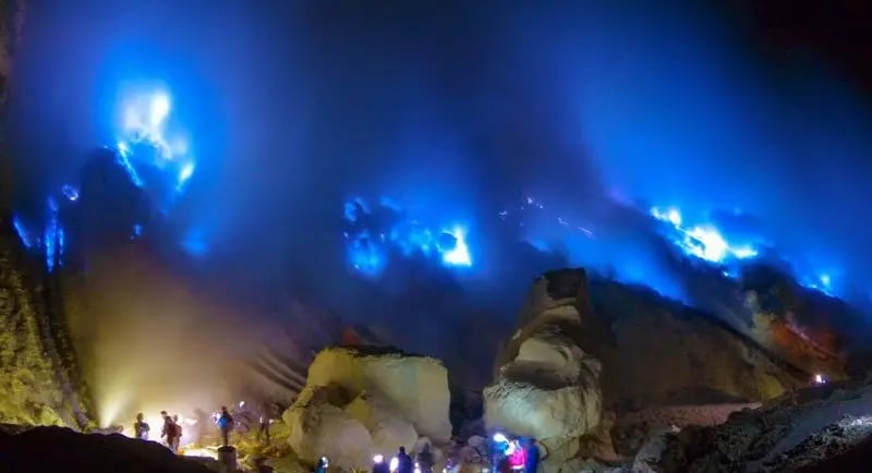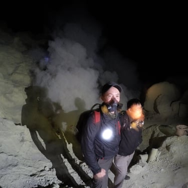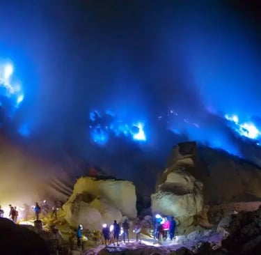 I tried to take a few photos, but the clouds made it difficult. The atmosphere was surreal: miners with torches hauling bright-yellow sulphur blocks on their shoulders, the hiss of burning gas, and that otherworldly blue light illuminating the crater walls.
